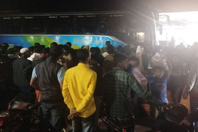রোববার সন্ধ্যায় উপজেলার বিভিন্ন এলাকা থেকে কয়েক’শ নারী পুরুষ নিয়ে ১০টি বাস ও অন্তত ১৫টি মাইক্রোকার নিয়ে ঢাকা অভিমুখে যাত্রা করে অন্তত পাঁচ শতাধিক নারী ও পুরুষ। এসময় গাড়িগুলো পথিমধ্যে আটকে দেন স্থানীয় উৎসুক জনতা।