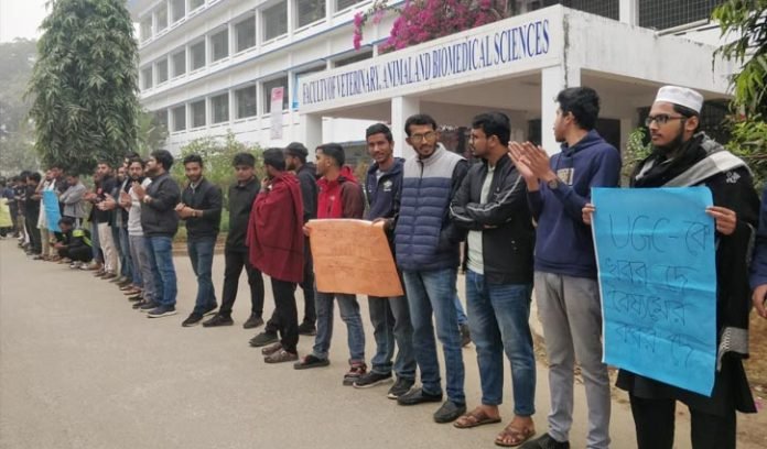 বুধবার (২১ জানুয়ারি) সকাল ১০টা থেকে শিক্ষার্থীরা বিশ্ববিদ্যালয়ের ভেটেরিনারি অনুষদের সামনে অবস্থান করে বিক্ষোভ ও মানববন্ধন কর্মসূচি পালন করেন।