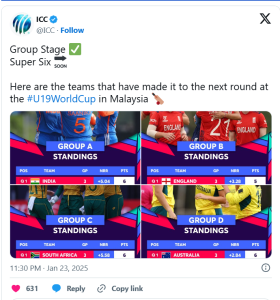 সুপার সিক্সে থাকা দুই দলের বিপক্ষে জয় নিয়ে শীর্ষ দুই দল ভারত ও অস্ট্রেলিয়া। ২ পয়েন্ট পেলেও রানরেটের হিসেবে এগিয়ে তালিকার তিনে আছে শ্রীলঙ্কা (‍+০.৫২৫)। চারে থাকা জুনিয়র নারী বাংলাদেশিদের রানরেট +০.৪২৫।