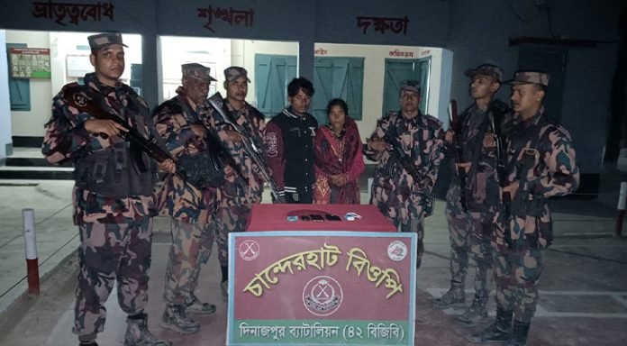 চান্দেরহাট বিজিবি ক্যাম্পের কোম্পানী কমান্ডার সুবেদার মনিরউদ্দীন জানান, শনিবার সকালে পীরগঞ্জ উপজেলার বৈরচুনা ইউনিয়নের চান্দেরহাট সীমান্তের ৩৩৩ এর ২ এস পিলার এলাকা দিয়ে পাশ^বর্তী রানীশংকৈল উপজেলার বাচোর ইউনিয়নের মাধবপুর গ্রামের নিরলা (৪৪) এবং তার ছেলে আকাশ রায় (২২) অবৈধ ভাবে ভারতে প্রবেশের সময় ভারতীয় সীমান্তরক্ষী বাহিনী বিএসএফ এর হাতে আটক হয়। বিষয়টি জানার পর আটক মা ও ছেলেকে ফেরত চায় বিজিবি। পরে বিকালে চান্দেরহাট বিজিবি এবং ভারতের চকসিবানন্দ ক্যাম্পের বিএসএফ এর মধ্যে পতাকা বৈঠক হয়।