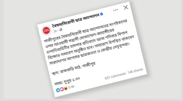 পোস্টে বৈষম্যবিরোধী ছাত্র আন্দোলন জানিয়েছে, ‌গাজীপুরের বৈষম্যবিরোধী ছাত্র আন্দোলনের সংগঠকদের ওপর আওয়ামী সন্ত্রাসী মোজাম্মেল-জাহাঙ্গীরের চাপাতিবাহিনীর হামলার প্রতিবাদে শনিবার বিশাল বিক্ষোভ সমাবেশ অনুষ্ঠিত হবে। সমাবেশে উপস্থিত থাকবেন সারা দেশের আপামর ছাত্র–জনতা ও কেন্দ্রীয় নেতারা।