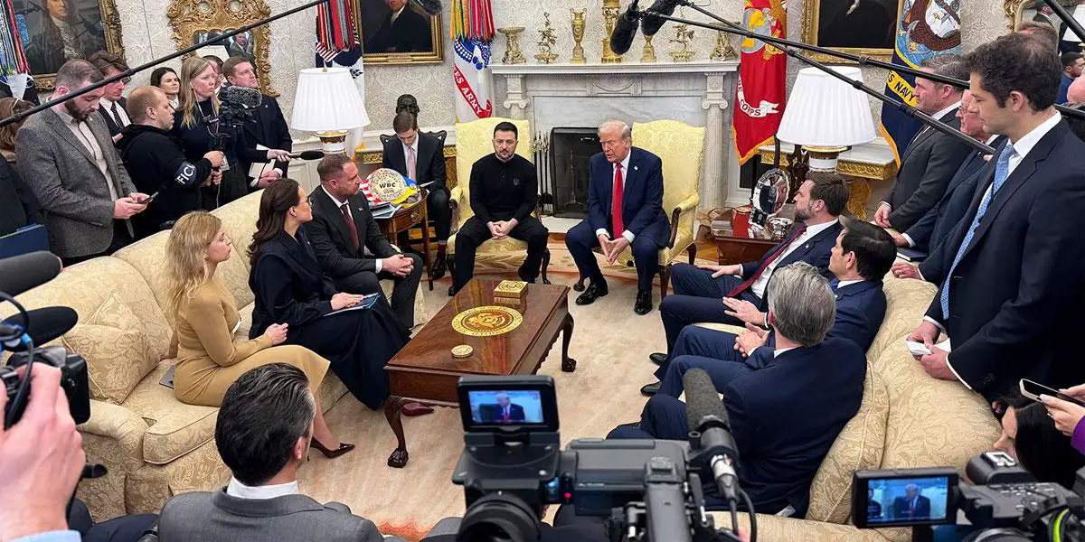 যুক্তরাষ্ট্রের প্রেসিডেন্ট ডোনাল্ড ট্রাম্পের সঙ্গে শেষ পর্যন্ত ইউক্রেনের প্রেসিডেন্ট ভলোদিমির জেলেনস্কির বৈঠক হলেও সেটি ছিল খুব উত্তপ্ত। বলা যায়, বৈঠকজুড়েই ইউক্রেনের প্রেসিডেন্ট ভলোদিমির জেলেনস্কি নাস্তানাবুদ হয়েছেন। বৈঠকের এক পর্যায়ে প্রেসিডেন্ট ট্রাম্প ও ভলোদিমির জেলেনস্কি তর্কে জড়িয়ে পড়েন। এ সময় ট্রাম্প বলেন, ‘রাশিয়ার সঙ্গে শান্তিচুক্তি করুন, না হয় আমরা এর মধ্যে নেই।’ ট্রাম্পের সঙ্গে উত্তপ্ত বাক্যবিনিময়ের পর জেলেনস্কি হোয়াইট হাউসের ওভাল অফিস থেকে বেরিয়ে যান। বাতিল করা হয় যৌথ সংবাদ সম্মেলন।
