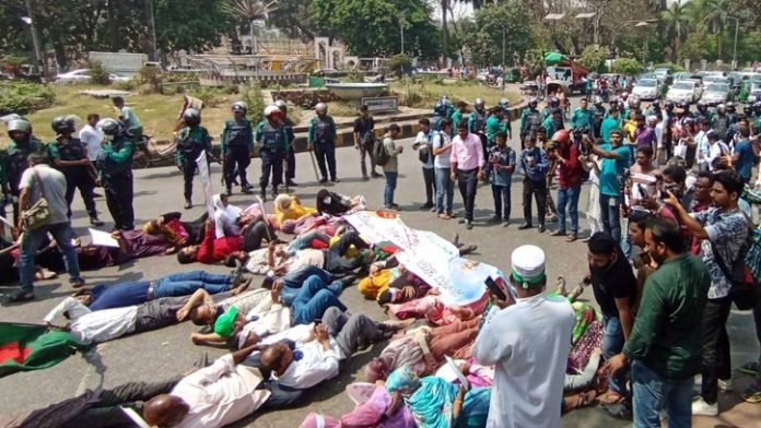 যমুনায় যেতে পুলিশের বাধা, সড়কে শুয়ে পড়েছেন শিক্ষকরা