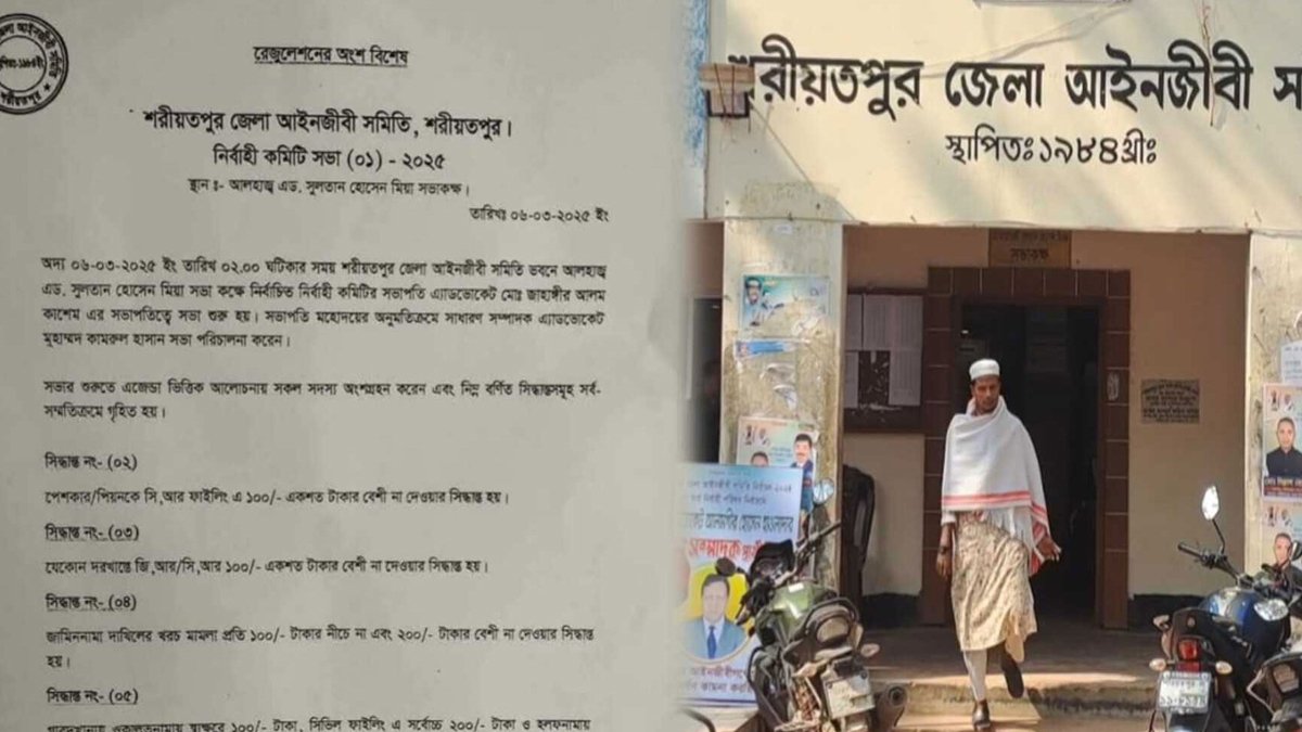 ঘুষের পরিমাণ সহনীয় রাখার সিদ্ধান্ত নিয়েছে শরীয়তপুর জেলা আইনজীবী সমিতি। তাদের দাবি, হয়রানি থেকে রক্ষা পেতেই এমন সিদ্ধান্ত নিয়েছেন তারা। এ সংক্রান্ত একটি সিদ্ধান্তপত্রও সামাজিক যোগাযোগমাধ্যমে ছড়িয়ে পড়েছে। এতে বিভিন্ন মহলে শুরু হয়েছে তীব্র আলোচনা-সমালোচনা।