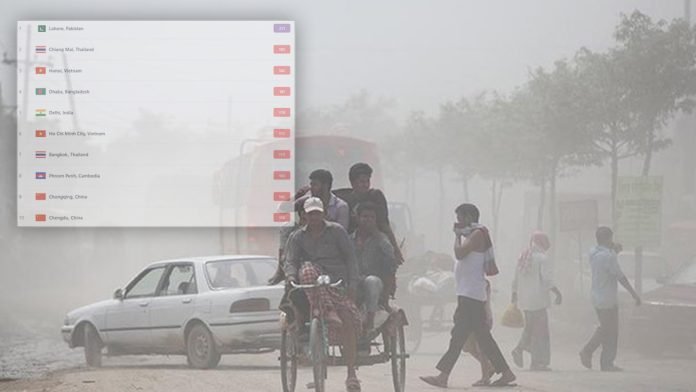 সংস্থাটি জানায়, ২৭১ স্কোর নিয়ে বায়ু দূষণের তালিকার শীর্ষে অবস্থান করছে পাকিস্তানের লাহোর শহর। সেখানকার বাতাসের মান ‘খুব অস্বাস্থ্যকর’। দ্বিতীয় স্থানে রয়েছে থাইল্যান্ডের চিয়াং মাই। শহরটির স্কোর ১৮৫, অর্থাৎ সেখানকার বাতাস বসবাসকারীদের জন্য ‘অস্বাস্থ্যকর’।