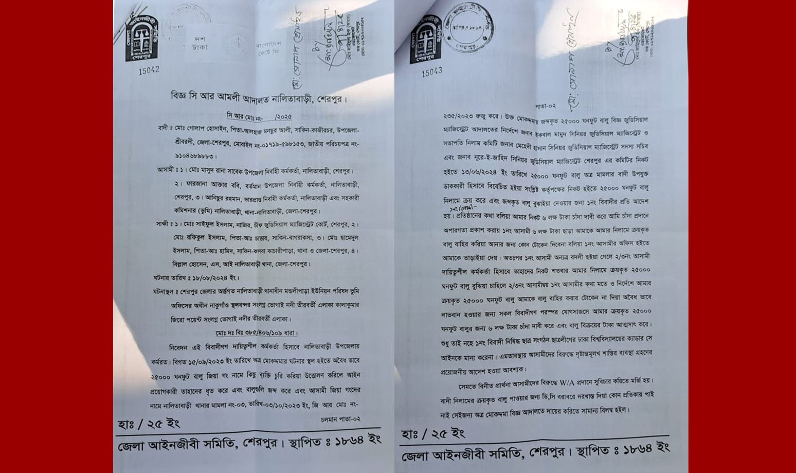 মামলার তথ্যমতে, গত বছরের জুন মাসে আদালতের মাধ্যমে ২৫হাজার ঘনফুট বালু নিলামে কিনে নেয় শ্রীবরদী উপজেলা ব্যবসায়ী গোলাপ হোসেন। নিলামে বিক্রয় করা বালু গোলাপ হোসেনকে বুঝিয়ে দিতে ৬ লাখ টাকা চাঁদা দাবি করেন তৎকালীন উপজেলা নির্বাহী কর্মকর্তা মাসুদ রানা। পরবর্তীতে মাসুদ রানা বদলী হয়ে জামালপুরের বকশীগঞ্জ উপজেলায় চলে গেলে বর্তমান উপজেলা নির্বাহী কর্মকর্তা ফারজানা আক্তার ববি এবং সহকারী কমিশনার (ভূমি) আনিছুর রহমানকে চাঁদার ওই টাকা না দিলে বালু বুঝিয়ে দিচ্ছেন না বলে দাবি করেন ব্যবসায়ী গোলাপ হোসেন। এনিয়ে আজ দুপুরে নালিতাবাড়ীর সিআর আমলী আদালতে বকশীগঞ্জ উপজেলা নির্বাহী কর্মকর্তা মাসুদ রানা, নালিতাবাড়ী উপজেলা নির্বাহী কর্মকর্তা ফারজানা আক্তার ববি এবং সহকারি কমিশনার (ভূূমি) আনিছুর রহমানকে বিবাদী করে ৬লাখ টাকা চাঁদা দাবির অভিযোগ তুলে মামলা দায়ের করেন ওই ভুক্তভোগী। পরে বিষয়টি নিয়ে তদন্তের জন্য শেরপুরের অতিরিক্ত পুলিশ সুপারকে নির্দেশ দেন আদালত।