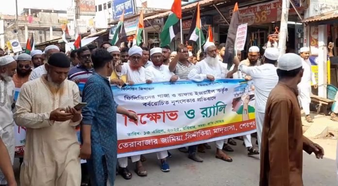 ফিলিস্তিনের গাজায় ইসরায়েলি বাহিনীর বর্বরোচিত গণহত্যা ও ধংসযজ্ঞের প্রতিবাদে এবং ইসরায়েলি পণ্য বর্জনের দাবিতে শেরপুরে বিক্ষোভ মিছিল ও সমাবেশ অনুষ্ঠিত হয়েছে।