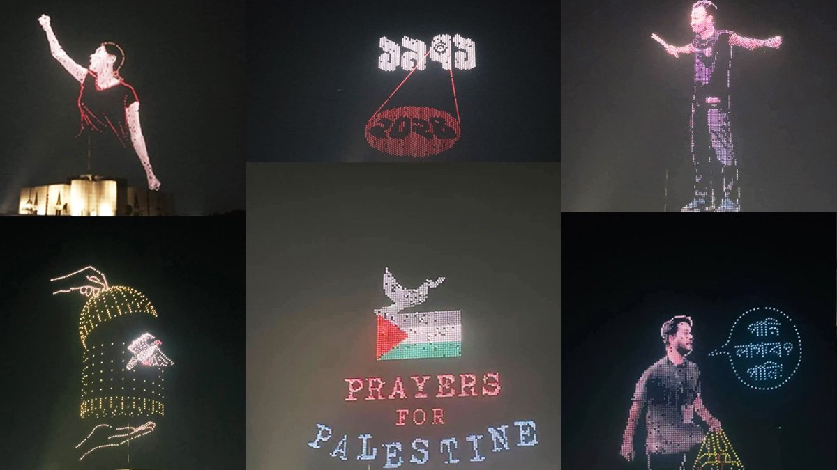 বাংলা বর্ষবরণের শেষ পর্যায়ের প্রস্তুতি চলছে। এর আগে, গতকাল শনিবার (১২ এপ্রিল) রাজধানীর সোহরাওয়ার্দী উদ্যানে অনুষ্ঠিত হয়েছে ইসরায়েলি আগ্রাসনবিরোধী লাখো জনতার সমাবেশ। আবার ছাত্র-জনতার গণঅভ্যুত্থান ও শেখ হাসিনার পতনের পর ফ্যাসিবাদী শক্তির অবসানের দাবিতে সোচ্চার অনেকে। সার্বিক বিষয়গুলোর প্রধান থিম নিয়ে রাজধানীর সংসদ ভবন এলাকায় ড্রোন ও লেজার শোর মাধ্যমে ফুটিয়ে তোলা হয় একাধিক বার্তা ও অর্থবহ প্রতিকৃতি।