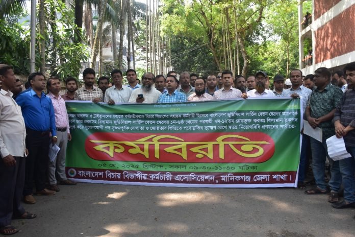 বাংলাদেশ জুডিশিয়াল সার্ভিস স্কেলের আলোকে বেতন কাঠামো ও স্বতন্ত্র নিয়োগ বিধি প্রণয়নের দাবিতে কর্মবিরতি পালন করেছেন মানিকগঞ্জ জেলা দায়রা জজ আদালত ও ম্যাজিস্ট্রেট আদালতের প্রায় ২০০ কর্মচারী।