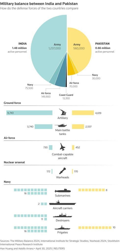পারমাণবিক বোমার সক্ষমতার দিক থেকে প্রায় সমানে সমান দেশ দুটি। ভারতের কাছে রয়েছে ১৭২টি, বিপরীতে পাকিস্তানের আছে ১৭০টি।