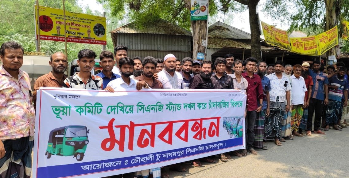 সিরাজগঞ্জের চৌহালী উপজেলার সিএনজি স্ট্যান্ড অবৈধভাবে দখল ও চাঁদাবাজির বিরুদ্ধে মানববন্ধন করেছে শ্রমিক-মালিকেরা।