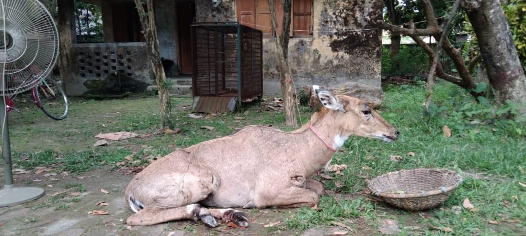 বন বিভাগ ও স্থানীয়রা জানায়, সরকার পাড়ার একটি ভুট্টা ক্ষেতে নীলগাই দেখার পর বন বিভাগে খবর দেওযা হয়। দুপুরে বন বিভাগের কর্মীরা নীলগাইটি উদ্ধার করে। এ সময় নীলগাইটির পা এবং শরীরের বিভিন্ন স্থানে আঘাতের চিহ্ন দেখা যায়।