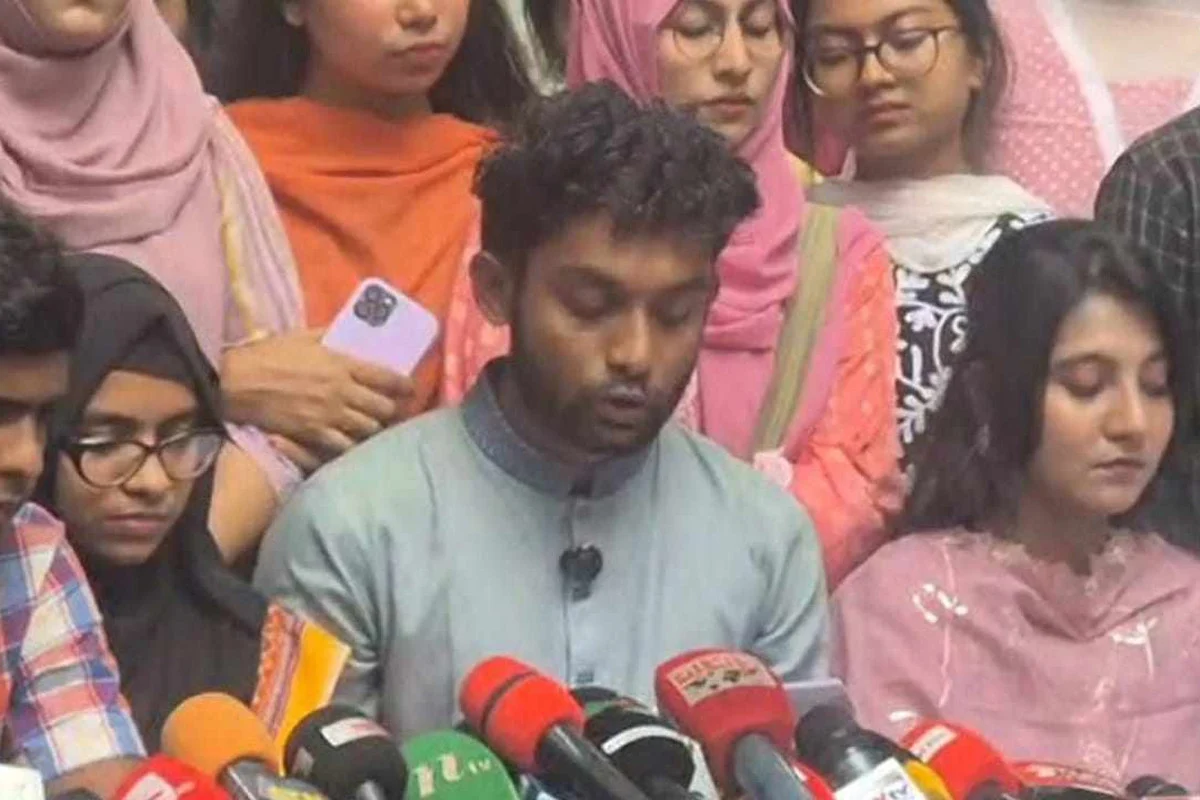 সংবাদ সম্মেলনে লিখিত বক্তব্য পড়ে শোনান বেগম বদরুন্নেসা সরকারি মহিলা কলেজের শিক্ষার্থী জাফরিন আক্তার ও ঢাকা কলেজের শিক্ষার্থী আবিদ হাসান।