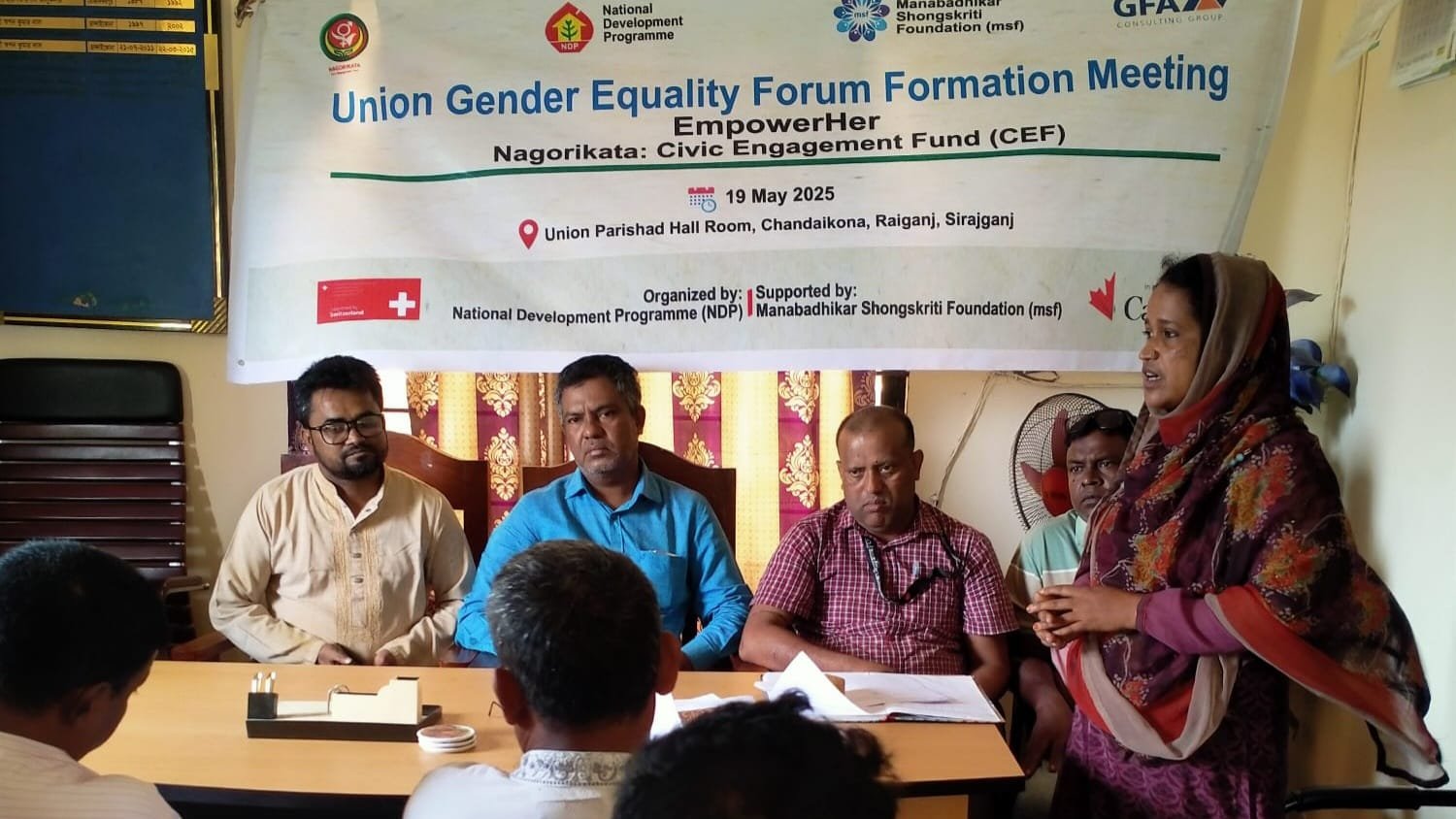 জাতীয় পর্যায়ের বেসরকারী উন্নয়ন সংস্থা ন্যাশনাল ডেভেলপমেন্ট প্রোগ্রাম (এনডিপি) এর আয়োজনে এবং মানবাধিকার সংস্কৃতি ফাউন্ডেশন (এমএসএফ) এর সহযোগিতায় নাগরিকতা সিভিক এনগেজমেন্ট ফান্ড: এমপাওয়ারহার প্রজেক্টের কার্যক্রমের অংশ হিসেবে সিরাজগঞ্জের রায়গঞ্জ উপজেলার চান্দাইকোনা ইউনিয়নের সকল ওয়ার্ডের প্রতিনিধিদের নিয়ে ইউনিয়ন জেন্ডার ইক্যুয়ালিটি ফোরাম ফরমেশন মিটিং অনুষ্ঠিত হয়েছে। সোমবার (১৯ মে) সকালে চান্দাইকোনা ইউনিয়ন পরিষদ সভা কক্ষে এ মিটিং অনুষ্ঠিত হয়।