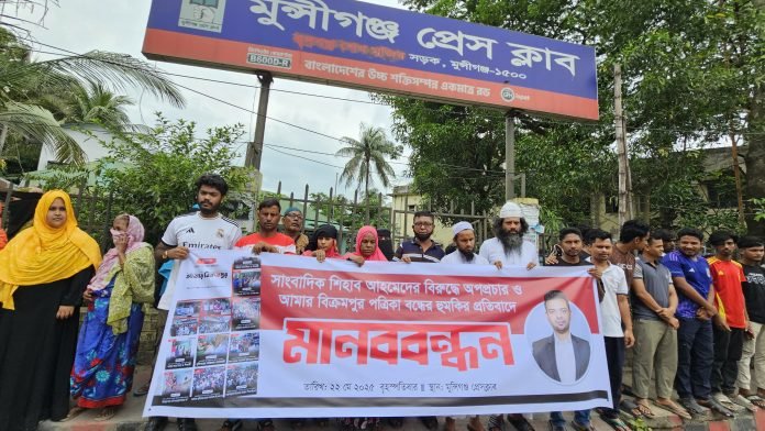 মুন্সিগঞ্জের স্থানীয় সংবাদভিত্তিক অনলাইন পত্রিকা ‘আমার বিক্রমপুরে’র সম্পাদক শিহাব আহমেদের বিরুদ্ধে অপপ্রচারের অভিযোগ এনে পত্রিকাটি বন্ধের হুমকির প্রতিবাদে মানববন্ধন কর্মসূচি পালিত হয়েছে।