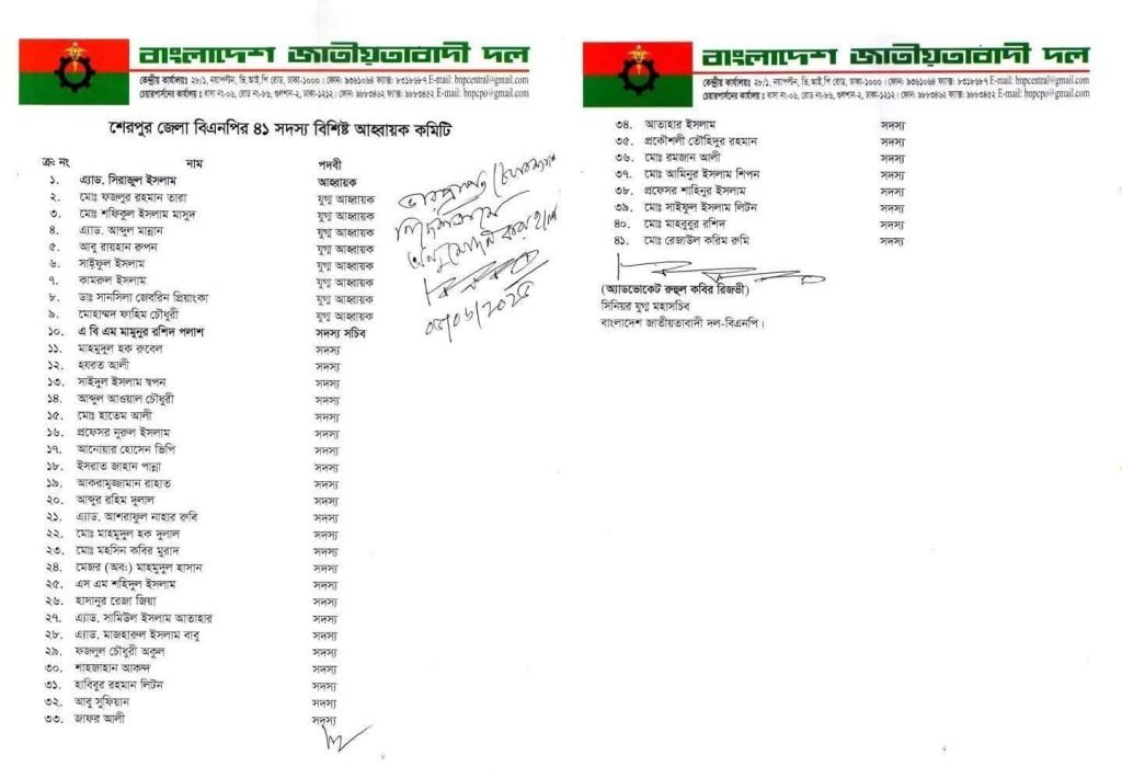 প্রায় ৫ মাস পর শেরপুর জেলা বিএনপির ৪১ সদস্যের আহ্বায়ক কমিটির ঘোষণা করা হয়েছে। এতে এ্যাডভোকেট সিরাজুল ইসলামকে আহ্বায়ক এবং মামুনুর রশিদ পলাশকে সদস্য সচিব করা হয়েছে।