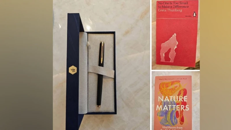 উপহার দেওয়া দুটি বইটি হলো গ্রেটা থুনবার্গের ‘নেচার ম্যাটারস: ভাইটাল পোয়েমস ফ্রম দ্য গ্লোবাল মেজরিটি’ ও ‘নো ওয়ান ইস টু স্মল টু মেইক ডিফারেন্স’। এ ছাড়া রয়েছে একটি কলম।