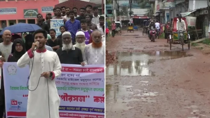 যশোর সরকারি মাইকেল মধুসূদন কলেজের সামনের শাহ আবদুল করিম সড়ক সংস্কারের দাবিতে বিক্ষোভ সমাবেশ ও পৌরসভা ঘেরাও করে শিক্ষার্থীরা। বুধবার (২৫ জুন) বৈষম্যবিরোধী ছাত্র আন্দোলন যশোর সরকারি এমএম কলেজ শাখার উদ্যোগে এই কর্মসূচি শুরু হয়।