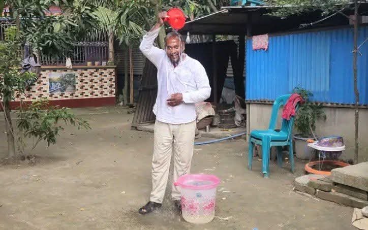 শনিবার দুপুরে সদর উপজেলার বজ্রযোগিনী ইউনিয়নের চূড়াইন গ্রামের নিজ বাড়ির উঠানে গ্রামবাসীর উপস্থিতিতে গোলাপ জলে গোসল করেন এ আওয়ামী লীগ নেতা।