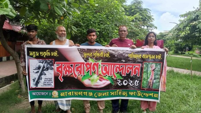 এবারের বৃক্ষরোপণ মূলত বৃক্ষ নিধনের বিরুদ্ধে আন্দোলন যা বৃক্ষরোপণ আন্দোলন নামে প্রতিষ্ঠিত হয়েছে। নারায়ণগঞ্জ জেলা প্রশাসক মহোদয়ের প্রতি আগ্রহ ও শ্রদ্ধা পোষণ করে। গ্রীন এন্ড ক্লিন পরিবেশ রক্ষার উদ্যোগকে সাধুবাদ জানিয়ে আমাদের আয়োজন। নারায়ণগঞ্জ জেলা সাহিত্য ফাউন্ডেশন এর বৃক্ষরোপণ আন্দোলন।