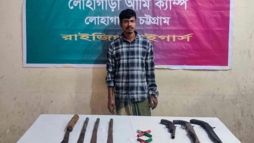 পরে তার দেওয়া তথ্যের ভিত্তিতে ঘরটি তল্লাশি করে তিনটি একনলা বন্দুক, আট রাউন্ড গুলি ও চারটি রামদা উদ্ধার করা হয়।