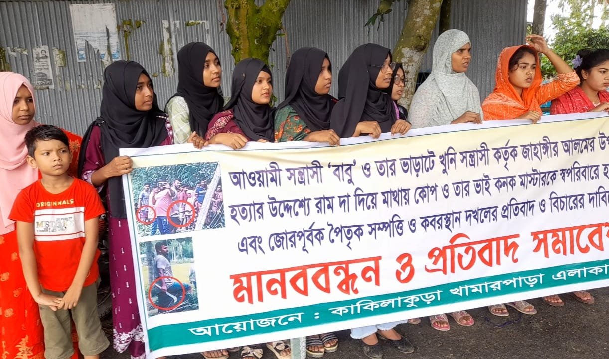 সোমবার (২৮ জুলাই) বিকেলে কাকিলাকুড়ার খামারপাড়া এলাকার সড়কে আধাঘন্টাব্যাপি এ মানববন্ধন অনুষ্ঠিত হয়।