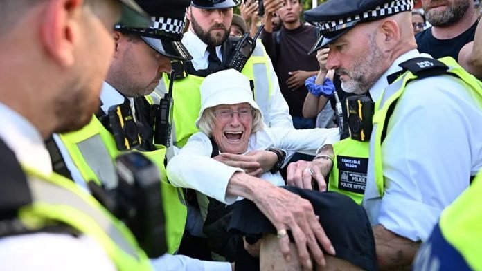 যুক্তরাজ্যের লন্ডনের পার্লামেন্ট স্কোয়ারে নিষিদ্ধ সংগঠন প্যালেস্টাইন অ্যাকশন-এর সমর্থনে শান্তিপূর্ণ বিক্ষোভে অংশ নিয়ে ৪৭৪ জনকে আটক করেছে মেট্রোপলিটন পুলিশ। স্থানীয় সময় শনিবার (৯ আগস্ট) এই প্রতিবাদে অংশগ্রহণকারীদের বিরুদ্ধে ‘সন্ত্রাসবিরোধী আইন লঙ্ঘন’, ‘পুলিশের ওপর হামলা’ ও ‘জনশৃঙ্খলা বিঘ্নের’ অভিযোগ আনা হয়েছে।