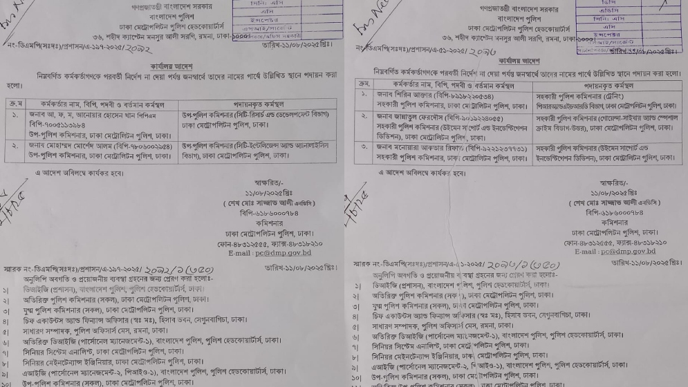 সোমবার (১১ আগস্ট) ডিএমপি কমিশনার শেখ মো. সাজ্জাত আলীর সই করা পৃথক দুই আদেশে এ পদায়ন করা হয়।