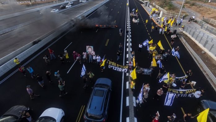 এদিকে, ইসরাইলের প্রধান প্রধান সড়ক অবরোধ করে এই বিক্ষোভ চলায় যান চলাচল বন্ধ হয়ে গেছে। দেশজুড়ে মহাসড়কগুলোতে এখন গাড়ির দীর্ঘ সারি দেখা যাচ্ছে। ভোগান্তিতে পড়েছেন যাত্রীরা। তেল আবিবের উত্তরে ইয়াকুম জংশনের কাছে কোস্টাল হাইওয়ে বা রুট টু-তে বিক্ষোভকারীরা সড়কের মাঝখানে আগুন জ্বালিয়ে দেয়ায় ওই মহাসড়ক পুরোপুরি বন্ধ হয়ে গেছে।