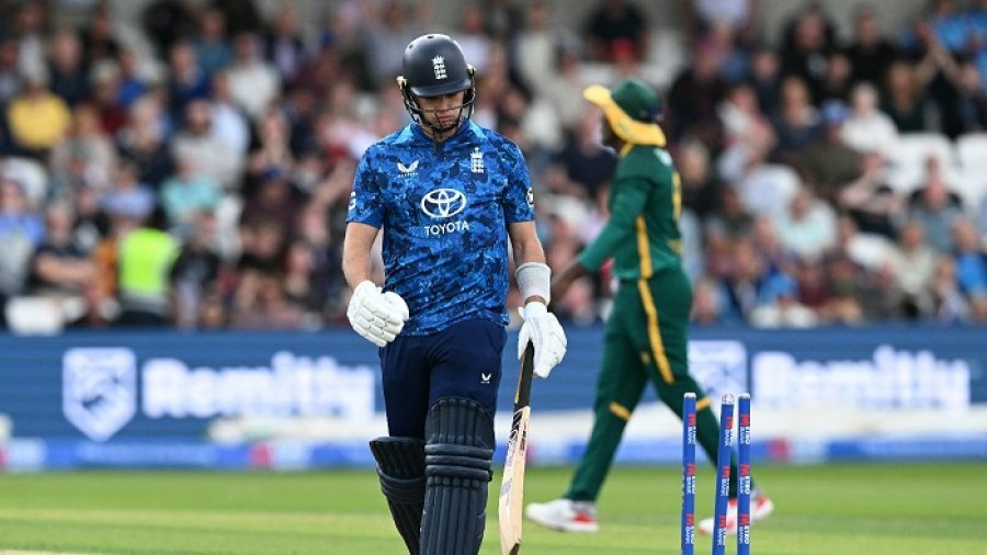 হোয়াইট বল ক্রিকেটের অধিনায়ক হ্যারি ব্রুকের অধীনে শুরুটা খারাপ ছিল না স্বাগতিকদের। টস হেরে ব্যাট করতে নেমে এক পর্যায়ে স্কোর ছিল ২ উইকেটে ৮২ রান। তার পর অধিনায়ক ১২ রানে রান-আউটের শিকার হলে এবং ওপেনার জেমি স্মিথ ৪৮ বলে সর্বোচ্চ ৫৪ রানে বিদায় নিলে অবিশ্বাস্য ধস নামে ইনিংসে। ৭.১ ওভারে শেষ সাত উইকেট পড়েছে মাত্র ২৯ রানে! স্পিনার কেশব মহারাজ ও ভিয়ান মুল্ডার ছিলেন মূল হন্তারক। মহারাজ ২২ রানে নিয়েছেন ৪ উইকেট। ম্যাচসেরাও তিনি। মুল্ডার ৩৩ রানে নিয়েছেন ৩টি।