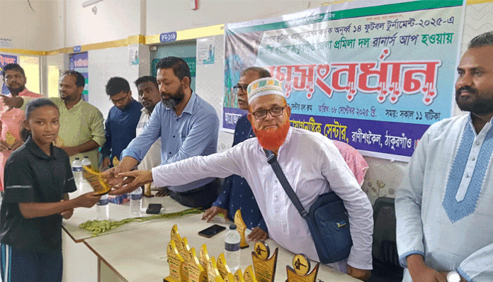 জাপান ফুটবল অ্যাসোসিয়েশন কর্তৃক আয়োজিত অনূর্ধ্ব-১৪ ফুটবল টুর্নামেন্টে জাতীয় পর্যায়ে রানার্স আপ হওয়ায় ঠাকুরগাঁওয়ের রাণীশংকৈল রাঙ্গটুঙ্গি মহিলা প্রমিলা ফুটবল দলকে বুধবার (৮ অক্টোবর) গণসংবর্ধনা দেওয়া হয়েছে। স্বাস্থ্যসেবা ডিজিটাল ডায়াগনস্টিক সেন্টারের আয়োজনে এই সংবর্ধনা অনুষ্ঠিত হয়।