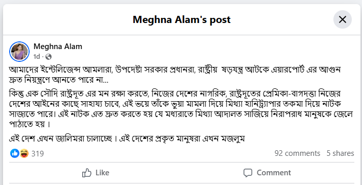 পোস্টটিতে মেঘনা লিখেছেন, “এই দেশ এখন জালিমদের হাতে। প্রকৃত মানুষগুলো হয়ে গেছে নিপীড়নের শিকার”। তার দাবি, ক্ষমতাসীন ও প্রভাবশালী গোষ্ঠী নিজেদের স্বার্থে নির্দোষ মানুষদের মিথ্যা মামলায় ফাঁসাচ্ছে। তিনি আরও বলেন, “আমাদের ইন্টেলিজেন্স, উপদেষ্টা এবং সরকার প্রধানরা রাষ্ট্রীয় ষড়যন্ত্র ঠেকাতে ব্যর্থ। নাটকীয়তা এতটাই দ্রুত ঘটে যে, রাতের আঁধারে ভুয়া আদালত বসিয়ে নিরপরাধদের জেলে পাঠানো হয়”।