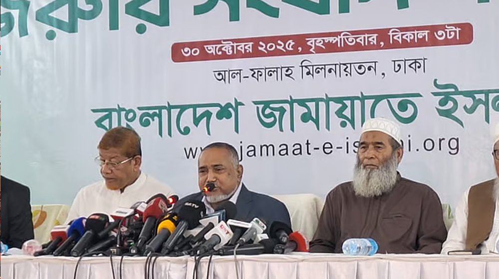 সংবাদ সম্মেলনে জামায়াত সরকারকে আবেদন জানান, মাত্র জুলাই সনদ বাস্তবায়ন political stability এবং জনগণের আস্থার একমাত্র পথ।