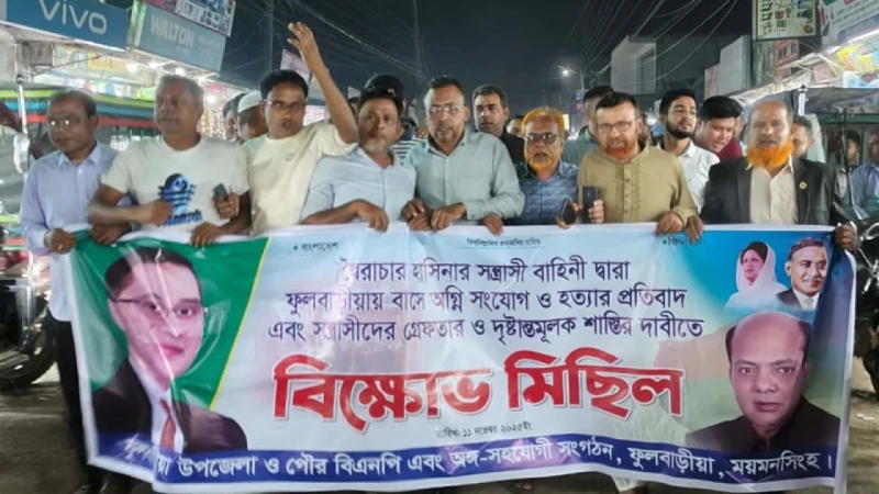 ফুলবাড়িয়ায় বাসে আগুনে চালক নিহতের প্রতিবাদে বিএনপির বিক্ষোভ