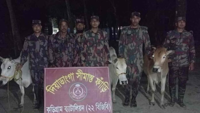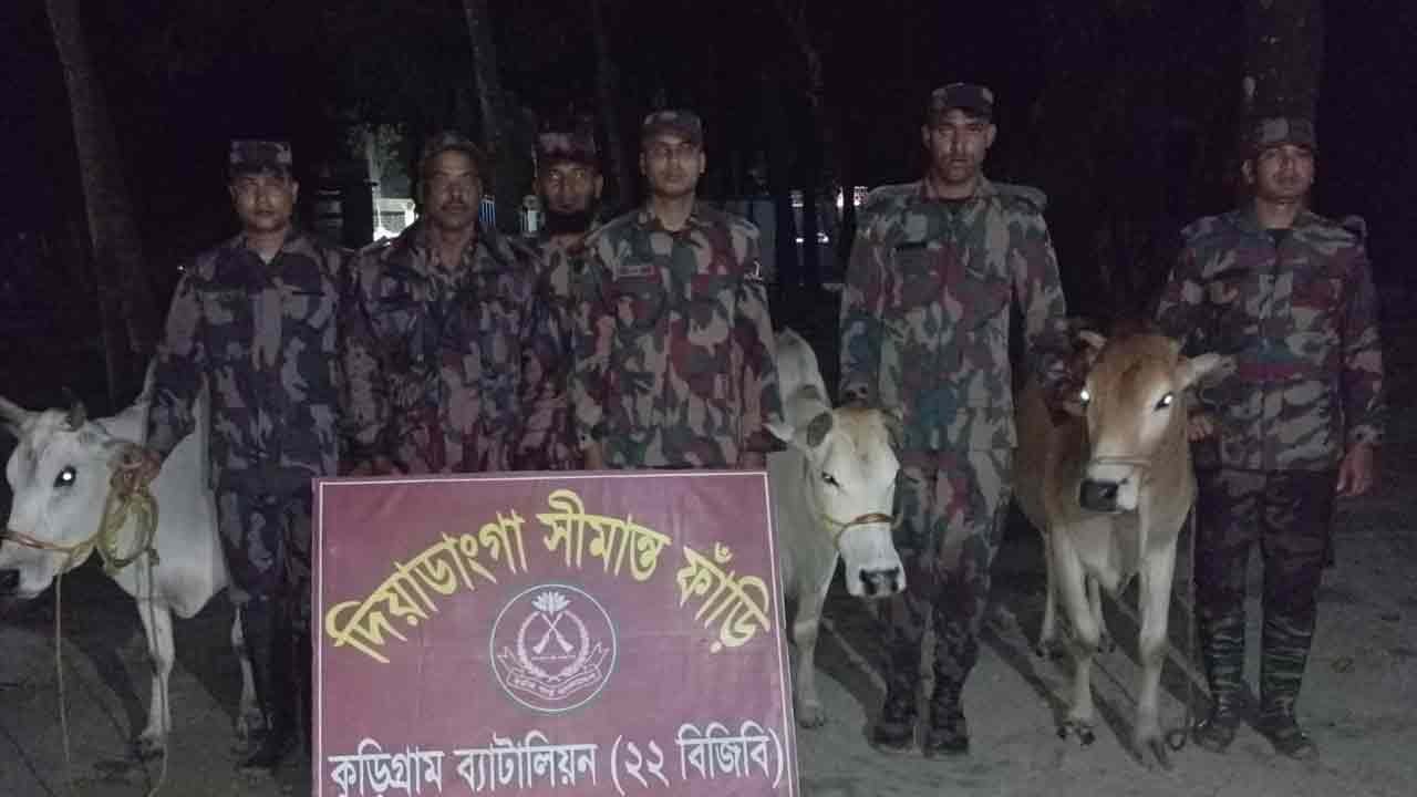 কুড়িগ্রাম সীমান্তে বিশেষ অভিযানে বিজিবির জব্দ ৪ ভারতীয় গরু ও ৭০ বোতল মদ