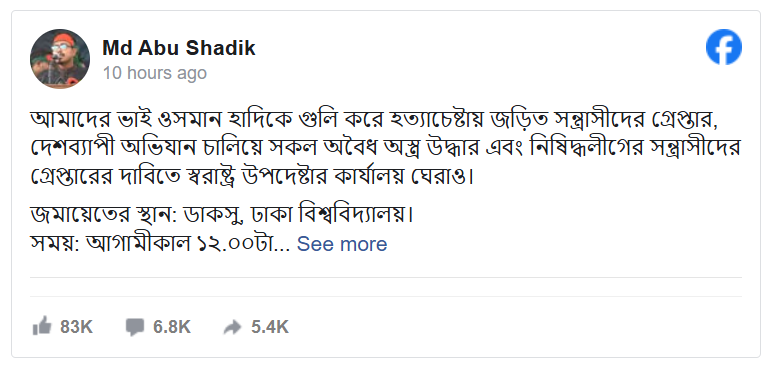 পোস্টে সাদেক কায়েম বলেন, আমাদের ভাই ওসমান হাদিকে গুলি করে হত্যাচেষ্টায় জড়িত সন্ত্রাসীদের গ্রেপ্তার, দেশব্যাপী অভিযান চালিয়ে সকল অবৈধ অস্ত্র উদ্ধার এবং নিষিদ্ধলীগের সন্ত্রাসীদের গ্রেপ্তারের দাবিতে স্বরাষ্ট্র উপদেষ্টার কার্যালয় ঘেরাও।