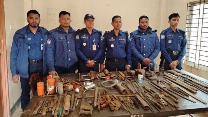 পরে ঘটনাস্থল তল্লাশি করে আগ্নেয়াস্ত্র ও গুলি তৈরির বিপুল সরঞ্জাম উদ্ধার করা হয়। উদ্ধারকৃত মালামালের মধ্যে রয়েছে—দুটি রাইফেলের গুলি, চারটি শটগানের খালি খোসা, দুটি বন্দুকের বাট, তিনটি বন্দুকের ট্রিগার বক্স, বন্দুকের নল হিসেবে ব্যবহৃত ছয়টি পাইপ, তিনটি বন্দুক তৈরির জোগান, একটি হাওয়ার মেশিন, দুটি বাটালি, পাঁচটি আড়ি ব্লেড ও একটি আড়ি ব্লেডের ফ্রেম, একটি করাত, একটি হাতুড়ি, একটি প্লাস, ছোট-বড় সাতটি রেত, একটি শান দেওয়ার মেশিন এবং একটি বানান নালিসহ অসংখ্য অস্ত্র তৈরির সরঞ্জাম।