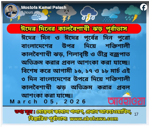 বৃহস্পতিবার (৫ মার্চ) দুপুর পৌনে ১টায় নিজের ভেরিফায়েড ফেসবুক আইডিতে দেওয়া এক স্ট্যাটাসের মাধ্যমে এই দুঃসংবাদ জানান তিনি। পূর্বাভাসে বলা হয়েছে, বিশেষ করে আগামী ১৬, ১৭ ও ১৮ মার্চ—এই তিন দিন বাংলাদেশের ওপর দিয়ে শক্তিশালী কালবৈশাখী ঝড় অতিক্রম করার প্রবল আশঙ্কা রয়েছে।