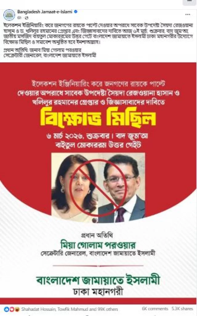 সদ্য সমাপ্ত ত্রয়োদশ জাতীয় সংসদ নির্বাচনে ‘ইলেকশন ইঞ্জিনিয়ারিং’ বা সূক্ষ্ম কারচুপির মাধ্যমে জনগণের রায় পাল্টে দেওয়ার গুরুতর অভিযোগ তুলেছে বাংলাদেশ জামায়াতে ইসলামী। এই ষড়যন্ত্রের নেপথ্য কারিগর হিসেবে অন্তর্বর্তীকালীন সরকারের সাবেক দুই প্রভাবশালী উপদেষ্টা সৈয়দা রিজওয়ানা হাসান ও ড. খলিলুর রহমানকে দায়ী করে তাঁদের দ্রুত গ্রেপ্তার ও জিজ্ঞাসাবাদের দাবি জানিয়েছে দলটি।