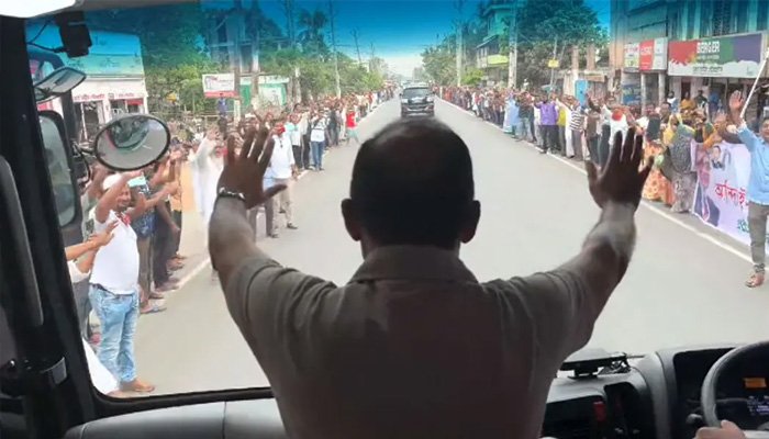 এসময় ৩০ কিলোমিটার রাস্তাজুড়ে দু’পাশে দাঁড়ানো হাজার হাজার লোকজন স্লোগান দিয়ে তাকে অভিবাদন জানান। প্রধানমন্ত্রী বাসের মধ্যে হাত নেড়ে অভিবাদনের জবাব দেন।
